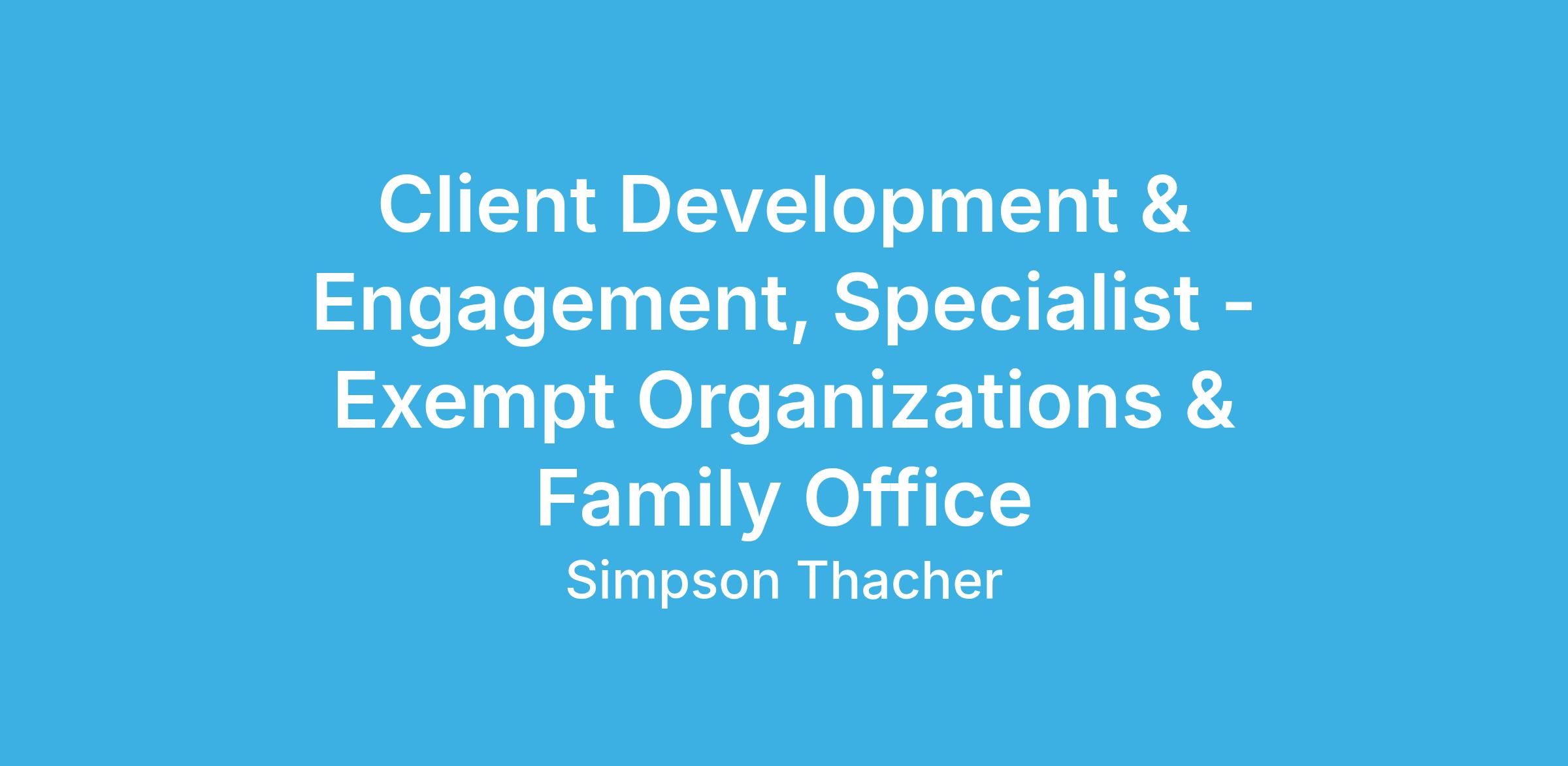 Simpson Thacher serves as fund counsel and trusted adviser to the world’s most successful and innovative investment firms. This is a high-impact opportunity to partner with senior attorneys and Client Development & Engagement leaders, helping to showcase the Firm’s experience, deepen client relationships, and drive strategic growth. You’ll be part of a dynamic team that values initiative, collaboration, and intellectual curiosity—and you’ll work closely with colleagues across the Exempt Organizations, Family Office and Personal Planning practices and our global Client Development & Engagement organization.