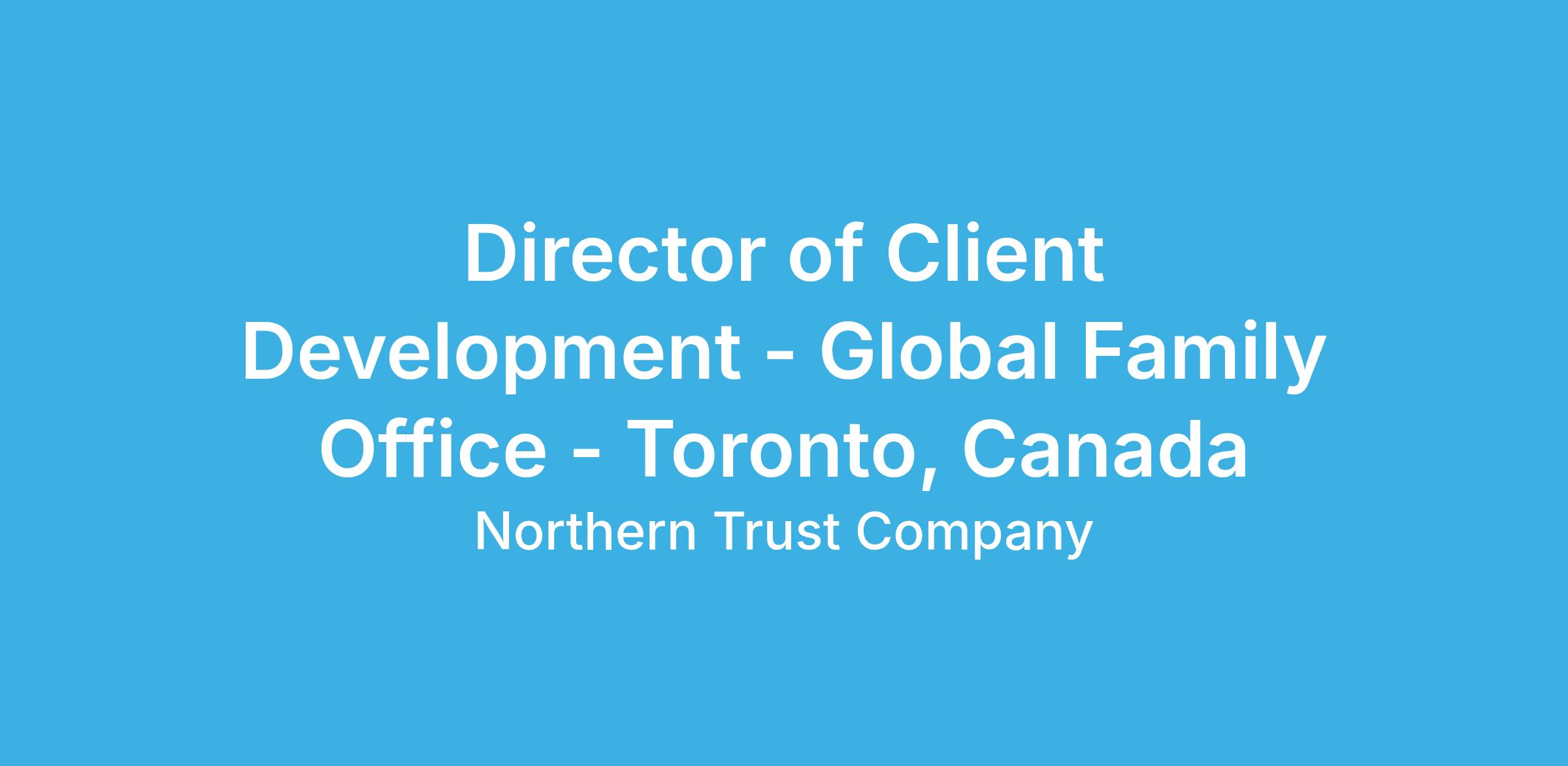 Lead market development officer (sales representative) for Northern Trust's Global Family Office business focused on the Canadian family office, business owner and private investment office client community. Primarily responsible for sourcing and closing new business opportunities across investments, asset administration, banking, technology and other advisory solutions. Establishes a productive referral source network to include key external advisors, Northern Trust Canada Institutional partners/teams, and across Northern's existing GFO regional clients. Reports directly to GFO Head of Client Development, Americas, as a senior member of the sales and advisory team.